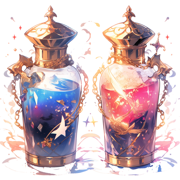 Introducing our most captivating creation yet - the Soulmates' Synergy Potion, a divine elixir meticulously crafted to unite souls in a bond of eternal love. This enchanting potion, bearing the essence of ancient magic, is comprised of two mesmerizing hues, each representing half of its potent spell.The first part, a captivating crimson elixir, symbolizes the fiery passion and desire that ignite the spark of love. Its rich aroma evokes feelings of longing and attraction, stirring the heart with an irresistible pull.The second part, a luminous azure elixir, embodies the tranquil depths of true love and understanding. Its ethereal glow whispers of trust, empathy, and emotional connection, casting a soothing aura of serenity.To experience the full power of the Soulmates' Synergy Potion, two individuals must each drink one part of the elixir. As the two elixirs merge within their souls, a profound bond is forged, uniting them in a love that transcends time and space.